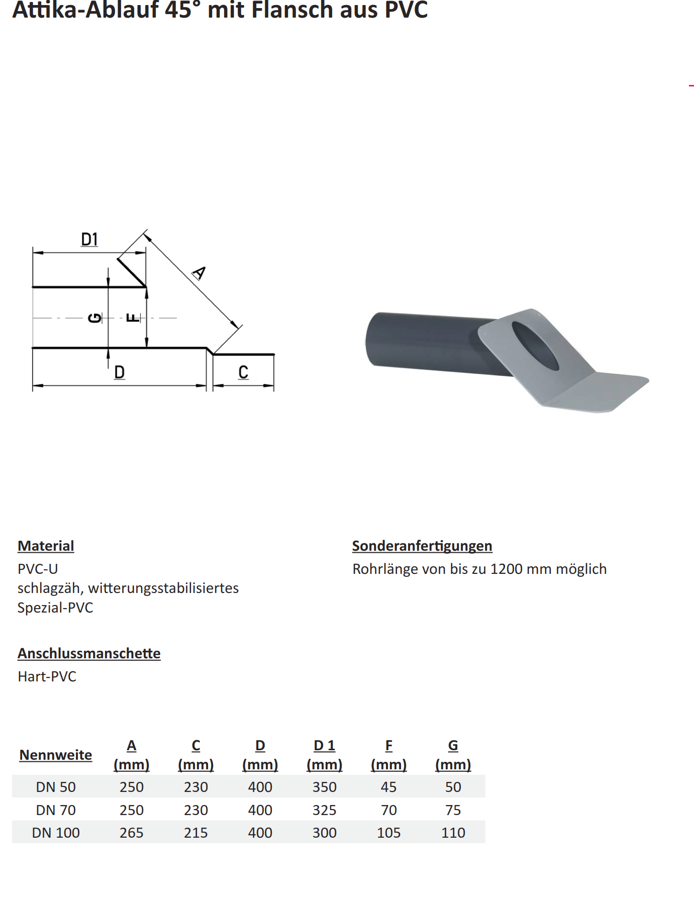 # Attika Ablauf, Winkelablauf, 45°, Notentwässerung, Überlauf, Dachablauf, Garage, Fertiggarage, Carport, Dachgully, Flachdachentwässerung, Bitumen, Hart-PVC, DN 50, DN 70, DN 75, DN 100, DN 110