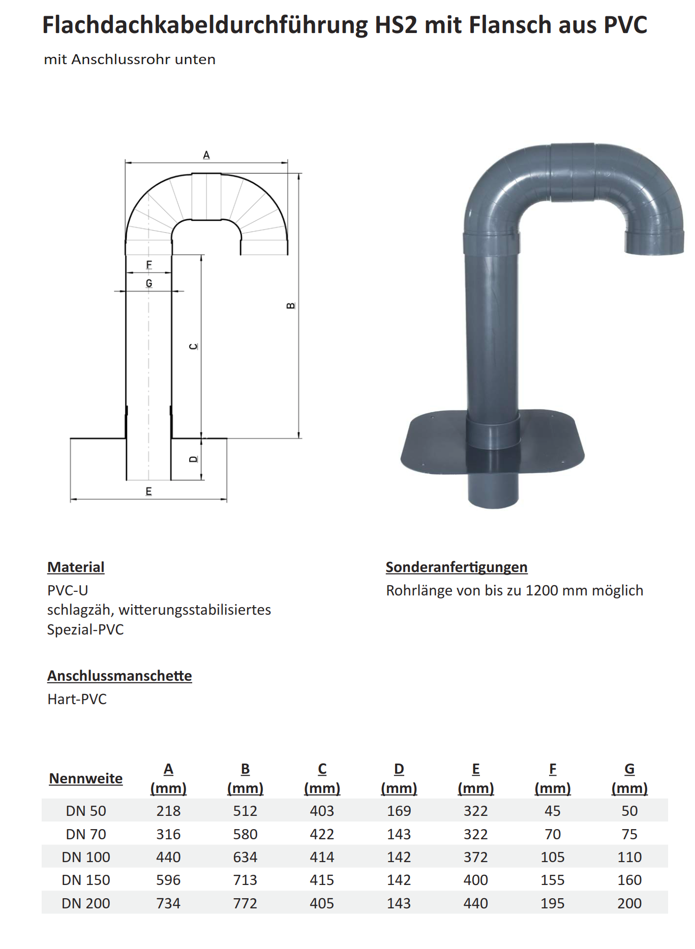 # Schwanenhals, Flachdachkabeldurchführung, Anschlussrohr, Dachdurchführung, Kabel, Antenne, Solar, Flachdach, DN 50, DN 70, DN 75, DN 100, DN 110, DN 150, DN 200