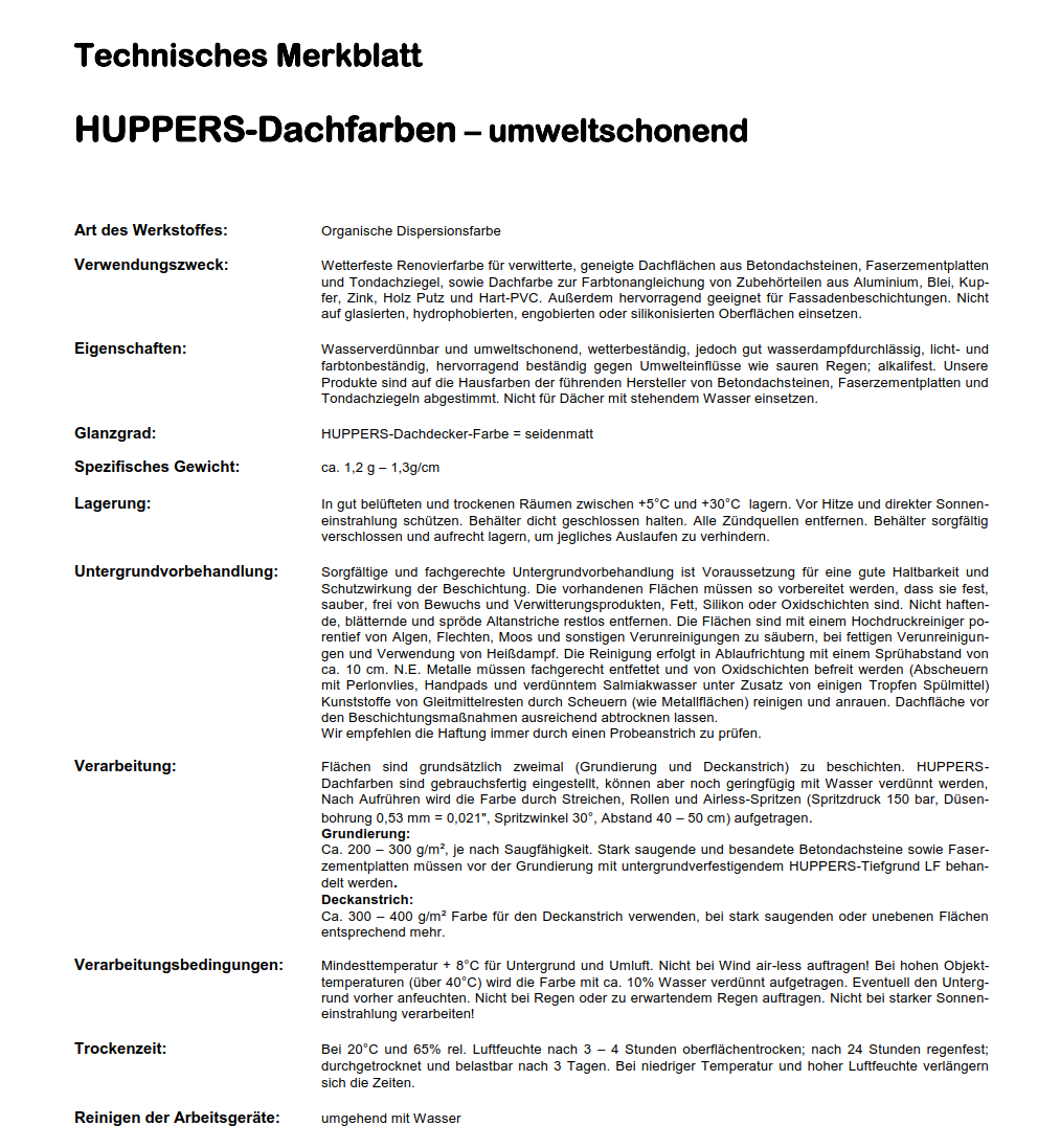 Es handelt sich um eine organische Dispersionsfarbe, die für verwitterte, geneigte Dachflächen aus Betondachsteinen, Faserzementplatten und Tondachziegel geeignet ist.